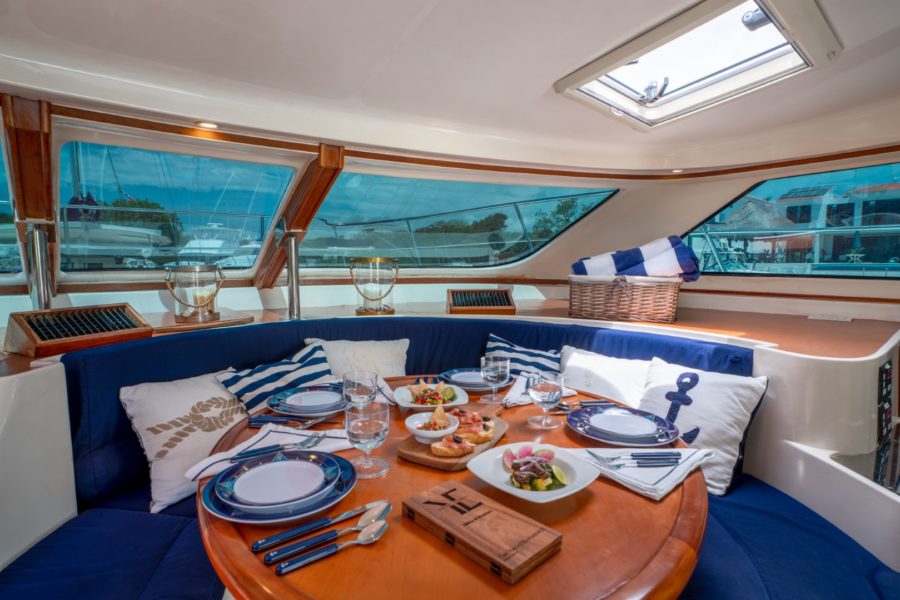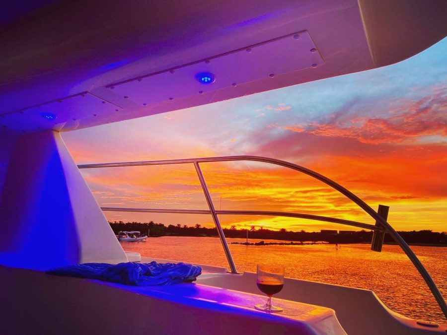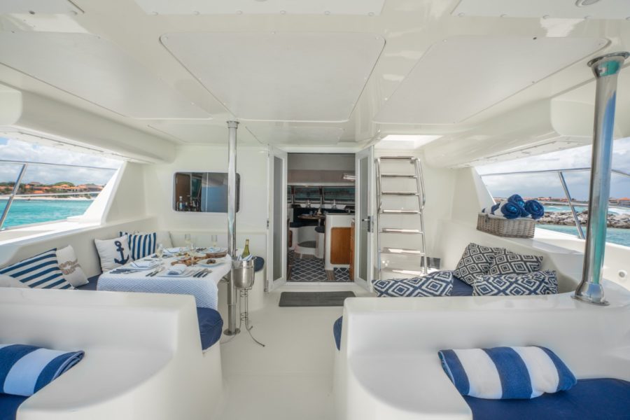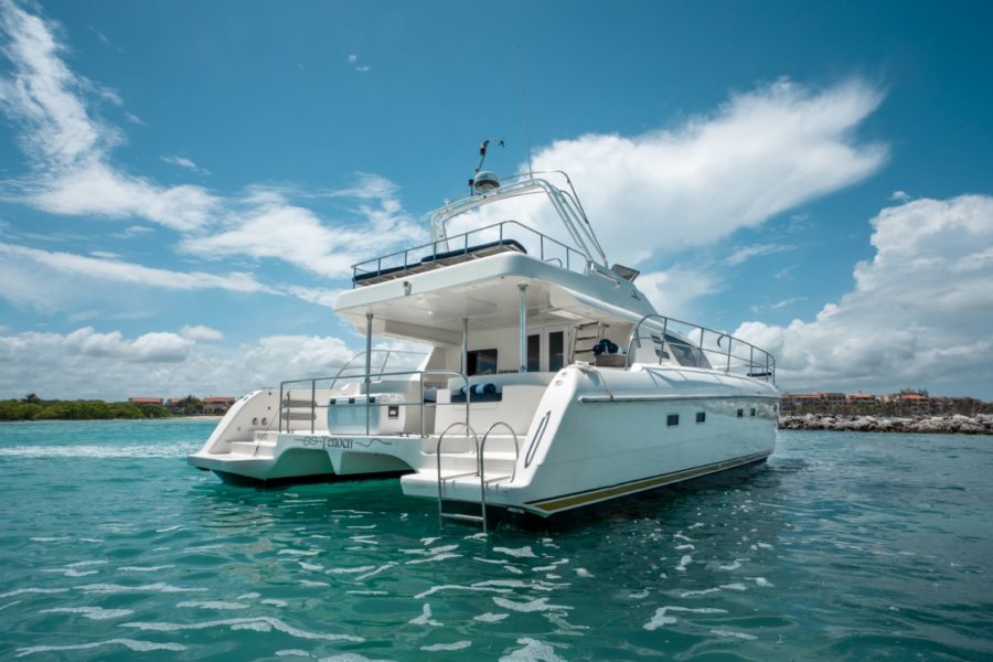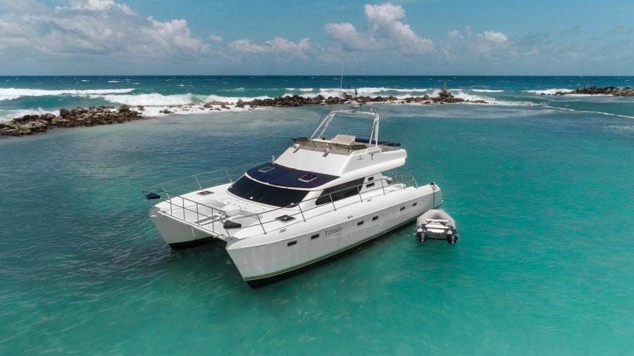 The 44 ft Motorcat Luxury Yacht Rental. She is perfect for groups, weddings, birthdays, and is now available for charter in our Puerto Aventuras Marina.
